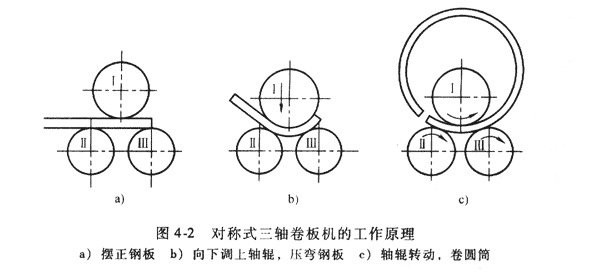 該機結構型式為三輥對稱式,上輥在兩下輥中間對稱位置作垂直升降運動,通過絲桿絲母蝸桿傳動而獲得,兩下輥作旋轉運動,通過減速機的輸出齒輪與下輥齒輪嚙合,為卷制板材提供扭矩。